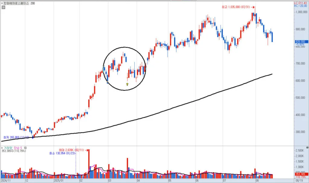 말 나온 김에 찾아보니 2025년 3월 21일 한화에어로스페이스가 유상증자를 발표한 날, 주가는 13% 넘게 빠졌어요. 아래 차트 보시죠. 이날 저가 기준 60만원이 깨졌더군요. 그렇지만 이후 빠르게 회복했고, 현재 주가는 150만원이 넘어요. 그렇다고 LIG D&A도 유상증자 하더라도 참고 견디면, 이후 2배 이상 오를 것이라는 이야기를 하는 건 절대 아닙니다.