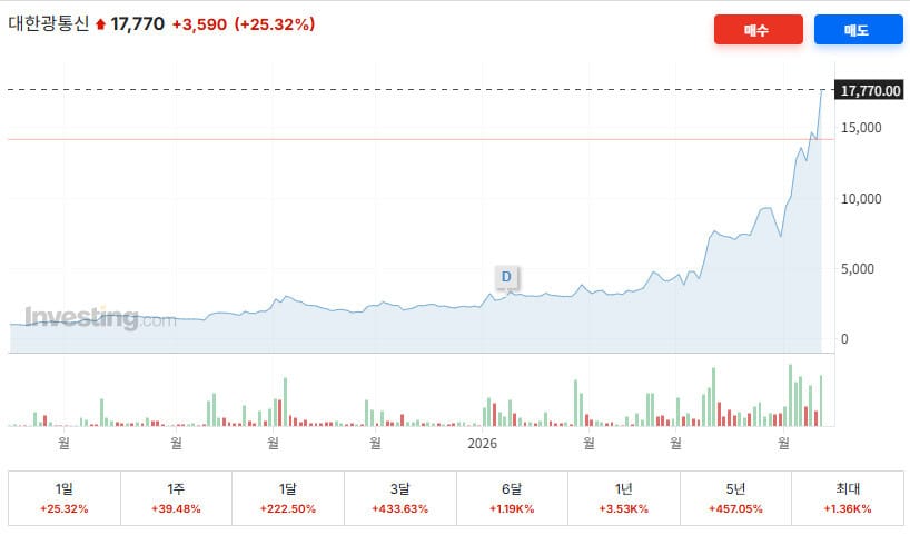 대한광통신(010170) 주가가 올해 초 2,000원대였어요, 4월 10일 18,340원까지 치솟으며 52주 신고가를 경신했어요. 상승률 800% 이상. 하루 거래대금이 1조 원을 넘기고, 투자경고종목 지정 예고까지 나왔어요.